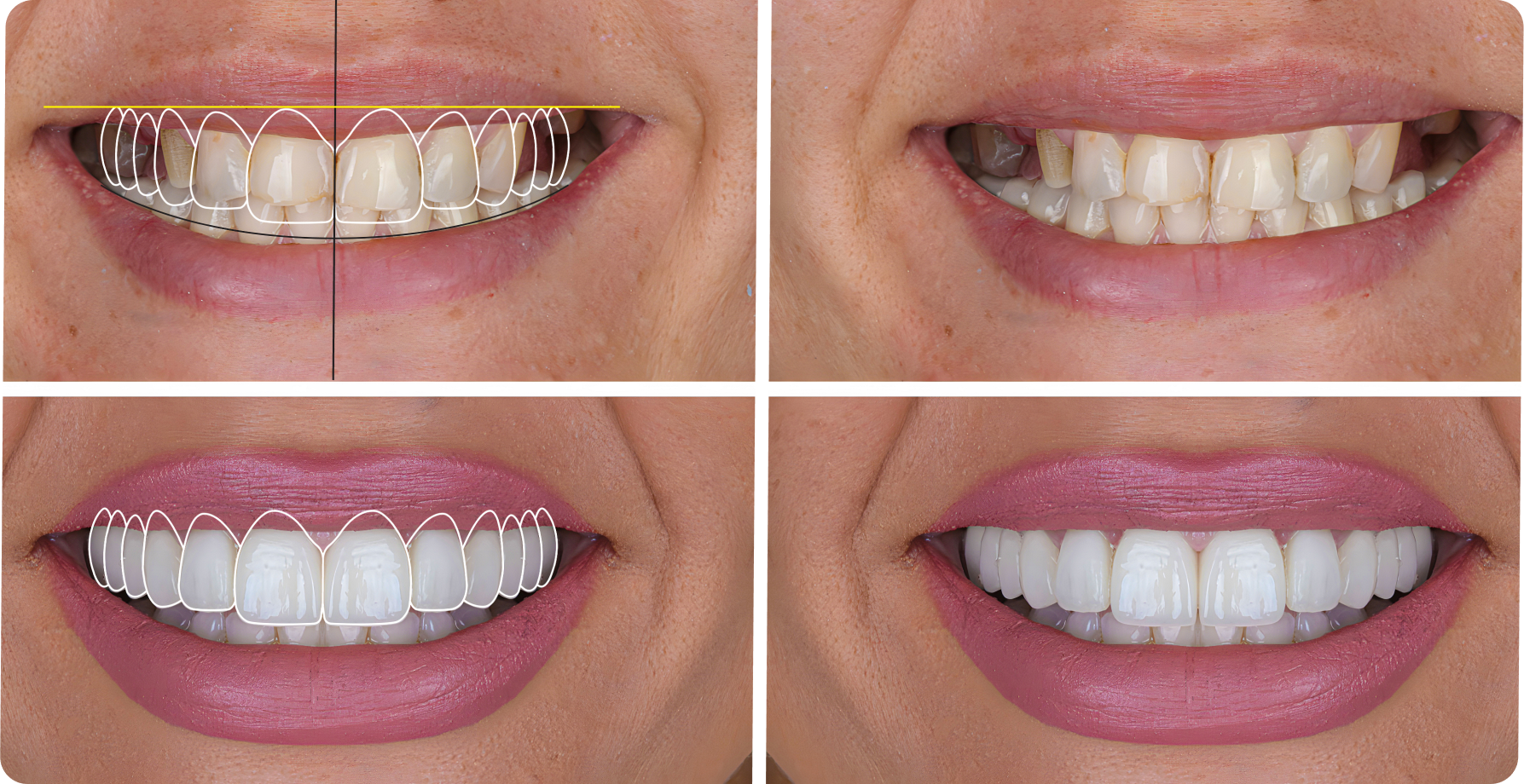 Après l’analyse, un projet esthétique est ensuite élaboré afin d’imaginer la forme et la position des futures facettes. À cette étape, le praticien peut également s’appuyer sur le Digital Smile Design pour visualiser le sourire dans son ensemble. Cette approche numérique étudie non seulement les proportions du visage, mais aussi la dynamique des lèvres et la position des dents, afin de proposer une projection cohérente. Grâce à ces images, le patient comprend ainsi plus facilement l’effet des différentes formes ou longueurs de facettes.
